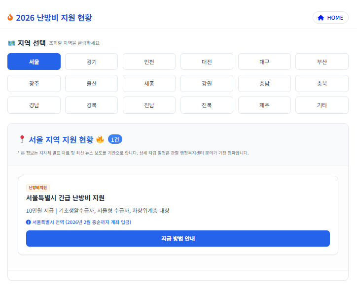 2026년 동절기 난방비 10만원은 서울(2월 중순까지 39만 가구 자동 입금)·충남·천안(2월 3일 발표 후 신속 집행)·수원(도비 5만원+시비 5만원)·파주(5만원 확정, 10만원 논의 중) 등에서 기초생활수급자·차상위계층에 지원하며, 정부 에너지바우처와 중복 수령 가능하고 대부분 별도 신청 없이 자동 지급되나 이사·계좌 변경 시 동주민센터 확인 필수입니다.