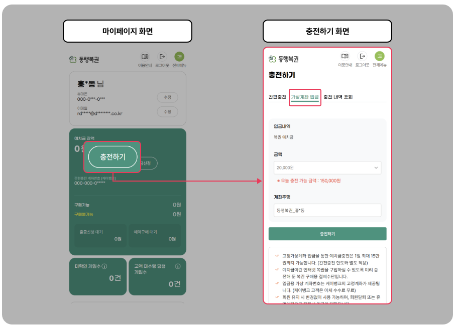 | 절차 | 마이페이지 → [충전하기] → [가상계좌 입금] |