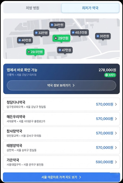 서울은 종로 5가 일대가 전국 최저가 수준을 유지하며, 강남 지역은 비대면 진료 앱을 통한 가격 비교가 활발합니다.