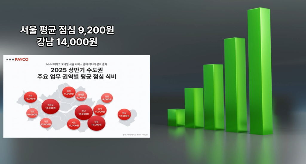 서울 전체 직장인 평균 점심값은 약 9,200원 수준이지만 오피스가 밀집한 업무지구는 이를 훨씬 웃돕니다.