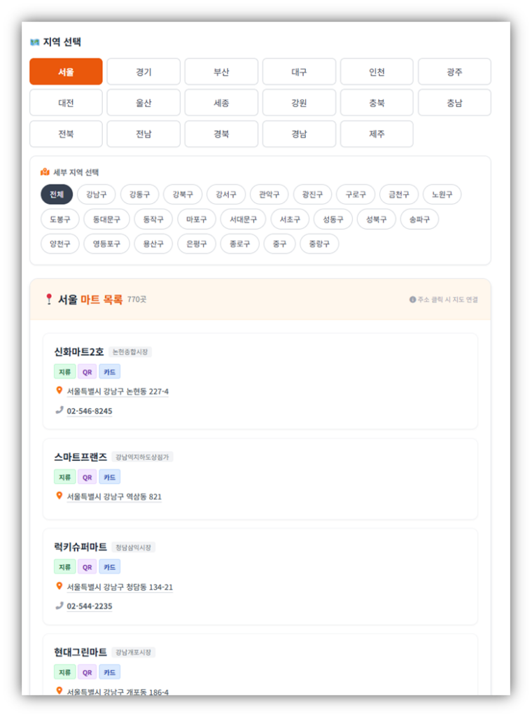 전국 광역시·특별시별 사용 가능 마트를 확인해 보세요.