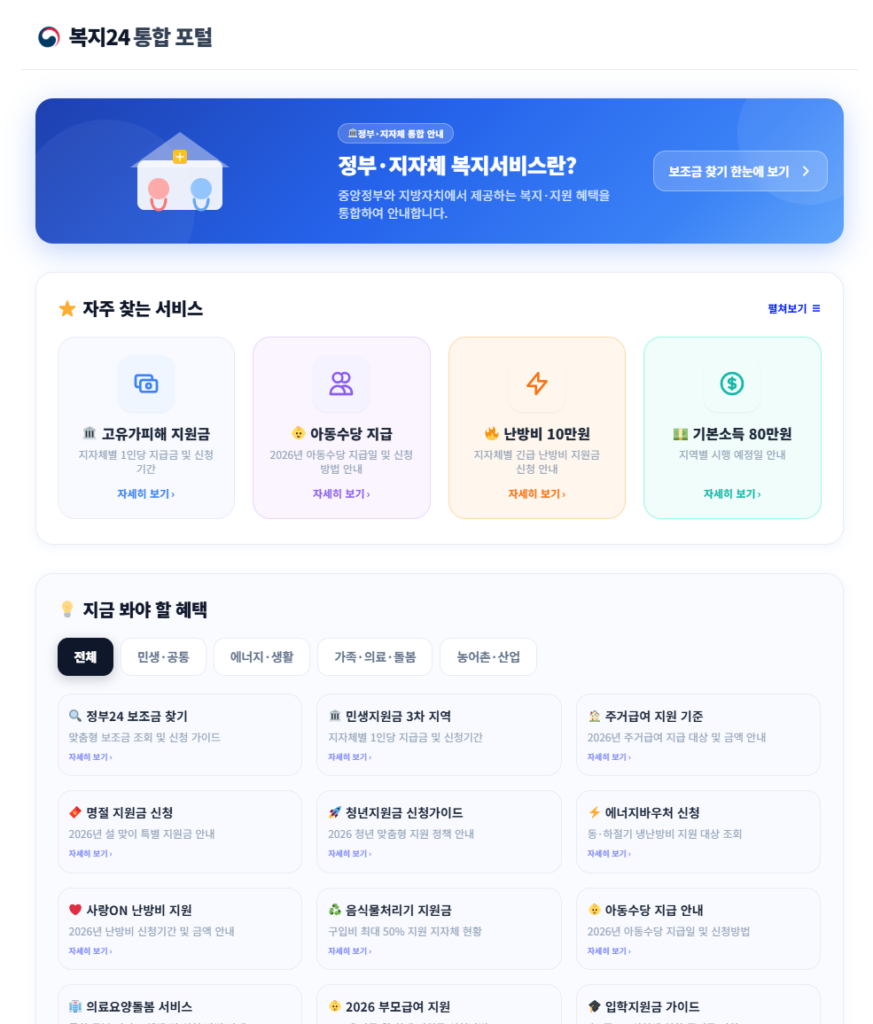 행정안전부가 운영하는 정부24 웹사이트 또는 앱에서 보조금24 메뉴를 이용하면 약 1만 여 개의 정부 혜택 중 본인의 연령·소득·거주지·자격 조건에 부합하는 지원금만 맞춤형으로 확인할 수 있습니다.