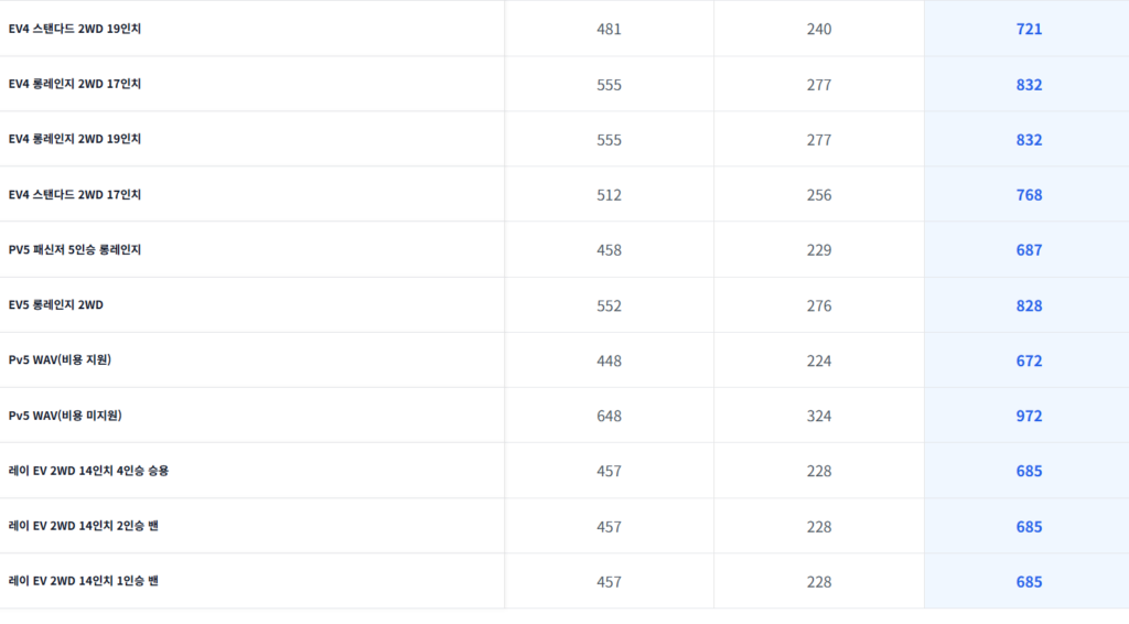 1. 국비환경부 (중앙정부)차량 모델별 전국 동일