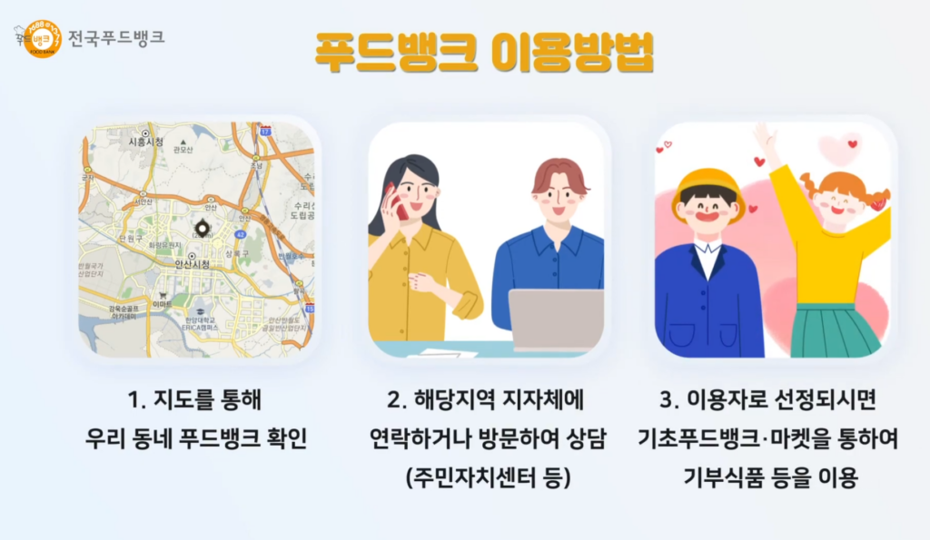- 긴급 지원: 먹거리 필요 시 지역별 기초 푸드뱅크