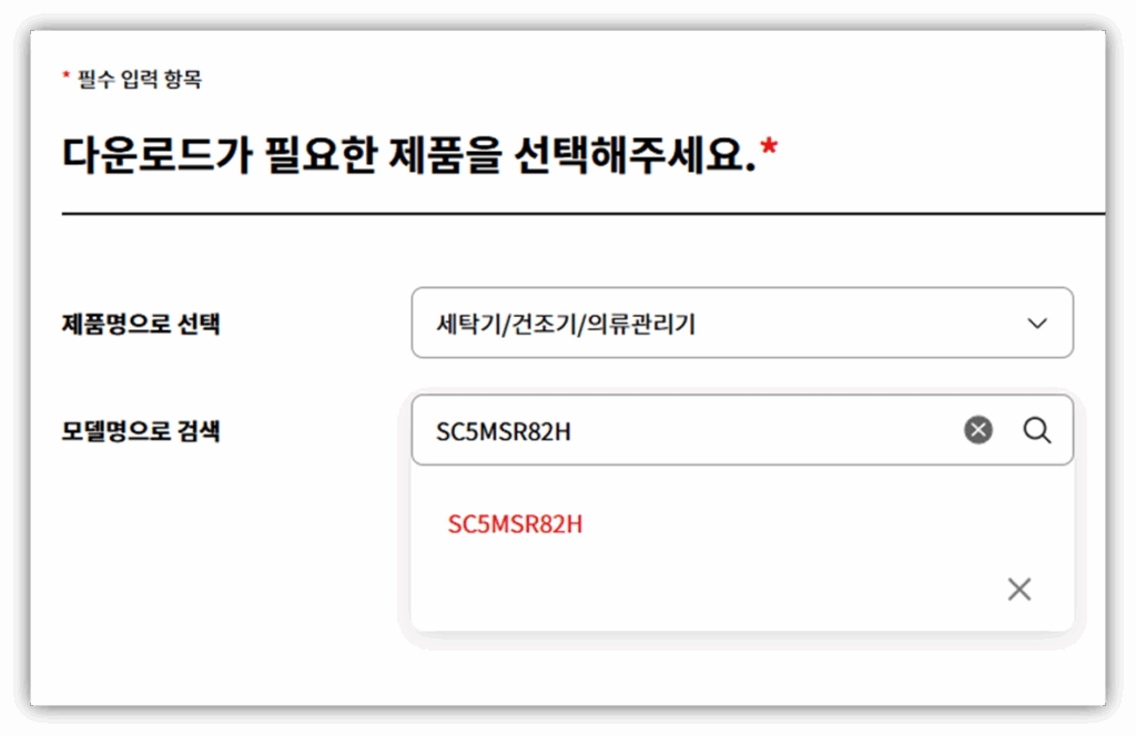 스타일러 매뉴얼 다운로드 방법은 하단 링크에 접속 후 사용하고 있는 모델을 입력하면 됩니다.